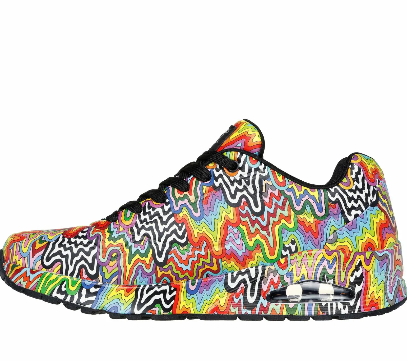Jen Stark brings her hypnotic and captivating colorful patterns to Skechers Street in this creative collaboration. The eye-catching Skechers Street x Jen Stark: Uno – Stark Drip Print features the artist’s signature drip design on a synthetic durabuck upper with a Skechers Air-Cooled Memory Foam® insole, and a visible Skech-Air® airbag midsole.