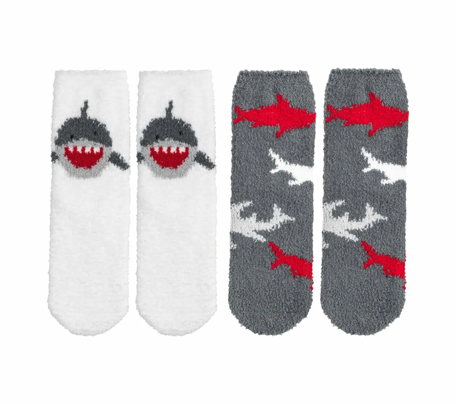Slip into stealthy fuzzy comfort wearing Skechers Accessories Shark Cozy Crew Socks – This 2-pack of fuzzy crew-length socks features a happy shark face pair and a shark silhouette print pair.