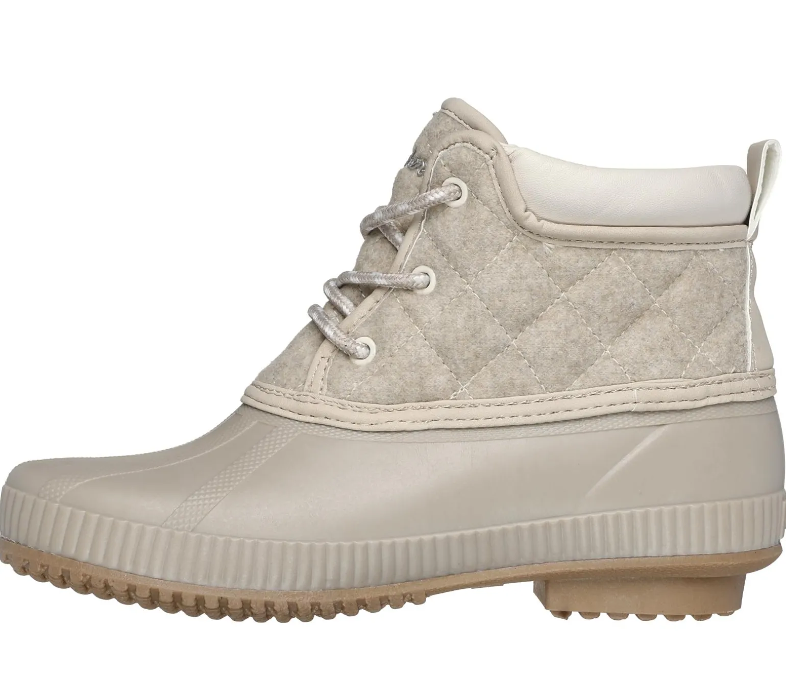 Make a splash in style and comfort wearing Skechers Arch Fit® Pond – Lil Puddles 2. This 3M® Scotchgard® treated mid-top duck boot features a durable synthetic upper with a quilted wool-look shaft, padded collar, and a cushioned Skechers Air-Cooled Memory Foam® insole.