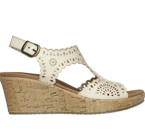 Step out with style and absolute comfort in Skechers Cali® Beverlee – Easy To Adore. This vegan wedge sandal features a synthetic laser cut upper with hook and loop closure, buckle accent, scalloped trim and a cushioned Luxe Foam® footbed.
