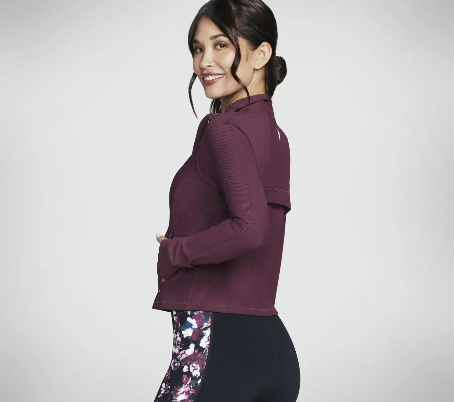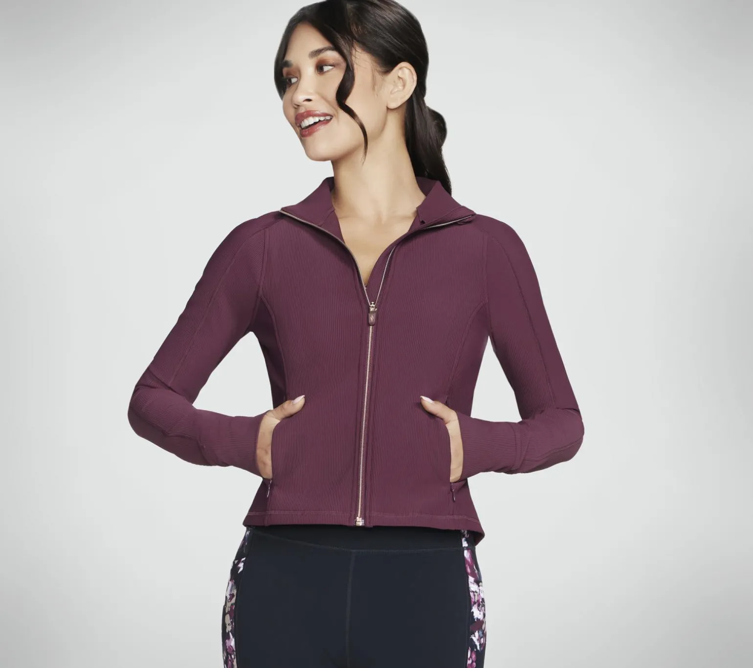 Keep a lean outerwear profile while staying warm and dry wearing Skechers GO Flex Rib Jacket. This full-zip mock neck jacket features our moisture-wicking GO Flex fabric, with a breathable back mesh panel and concealed security pockets.