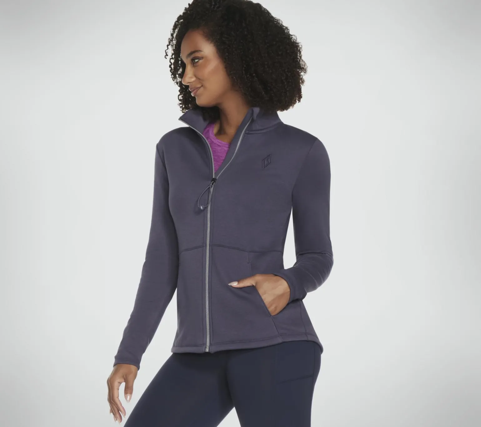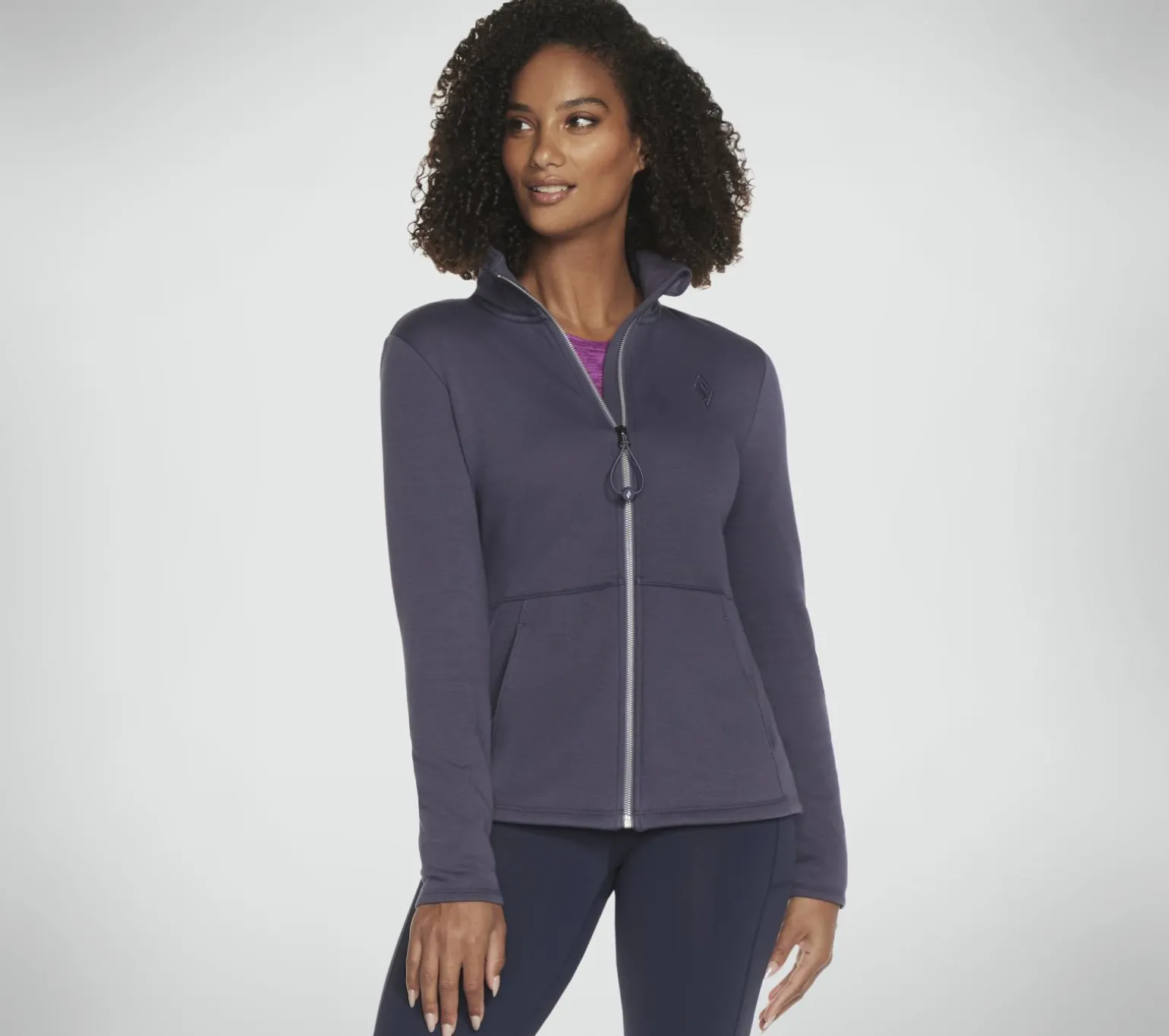 Relax in easy-going comfort and style with Skechers GO SNUGGLE® Jacket. This medium weight jacket features a soft stretch-knit fleece fabric, full zip closure, on-seam pockets and a mock neck.