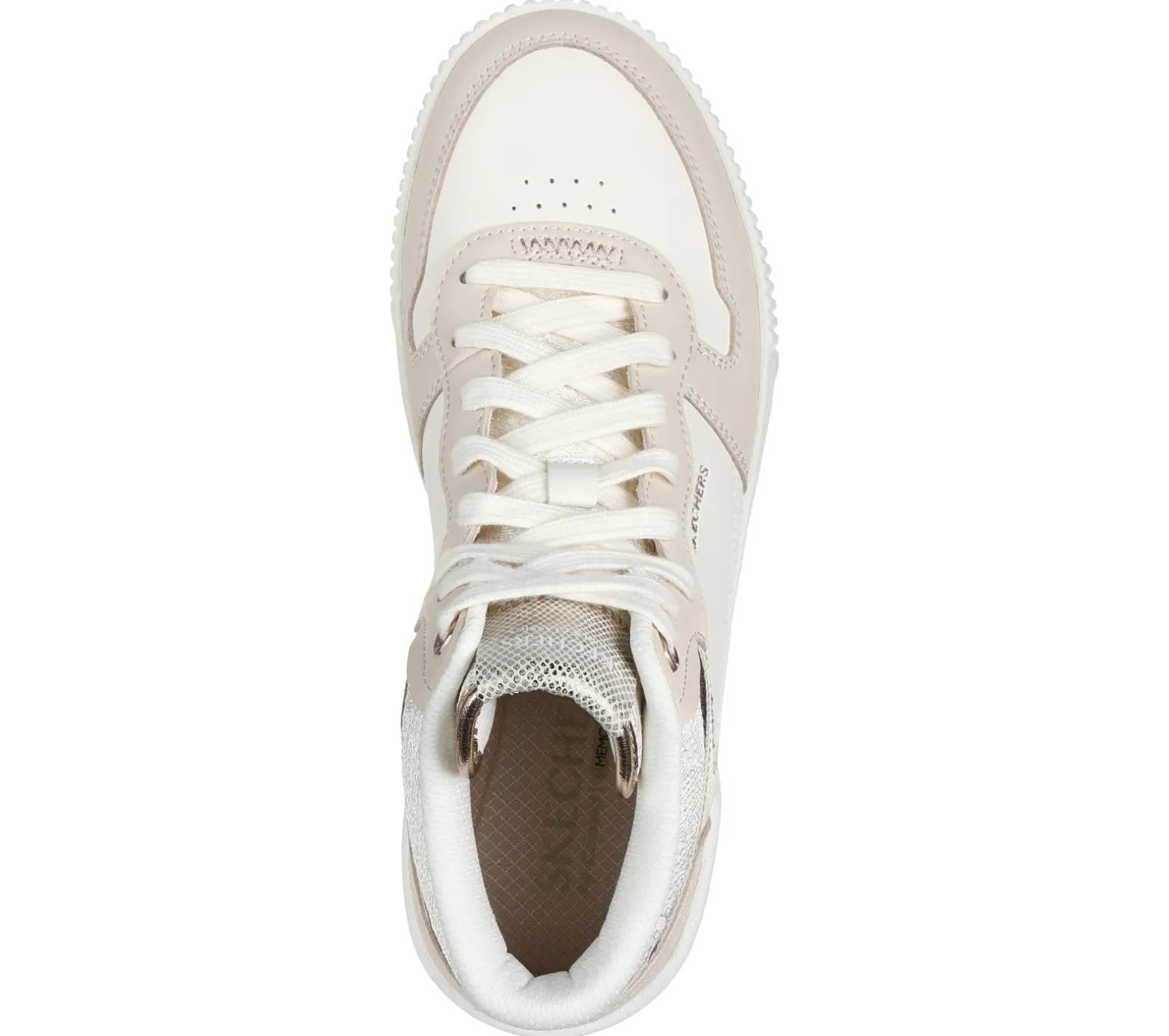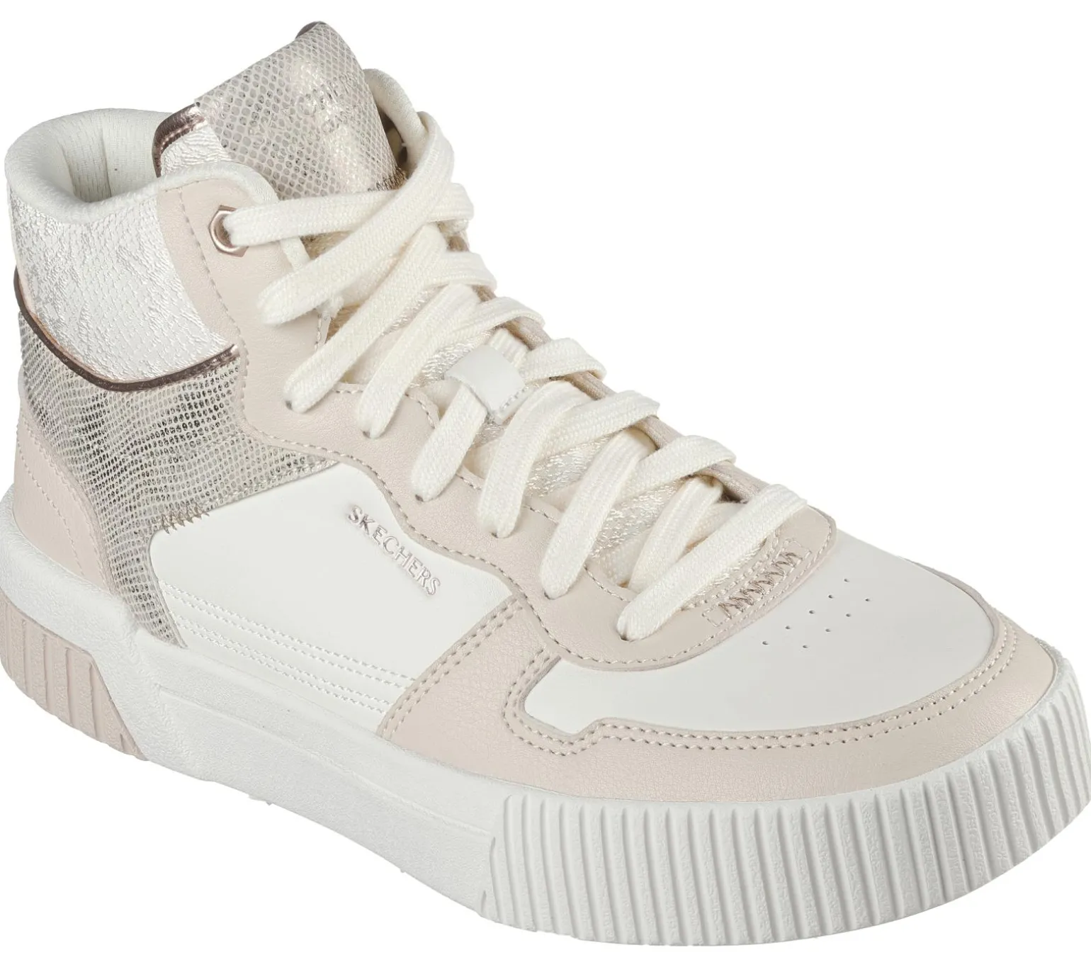 Stand out with eye-catching style in Skechers Jade – Bit Of Glamour. This lace-up high-top design features a duraleather upper with lace detail and metallic trim and a cushioned Skechers Air-Cooled Memory Foam® comfort insole.