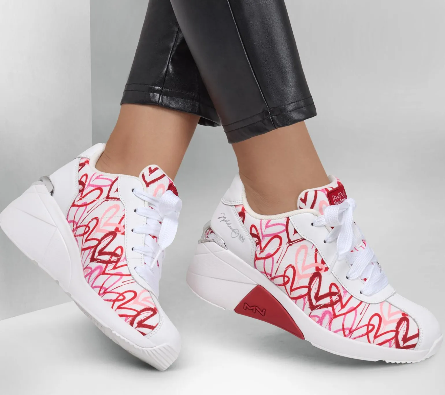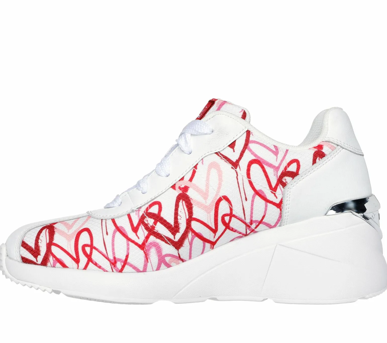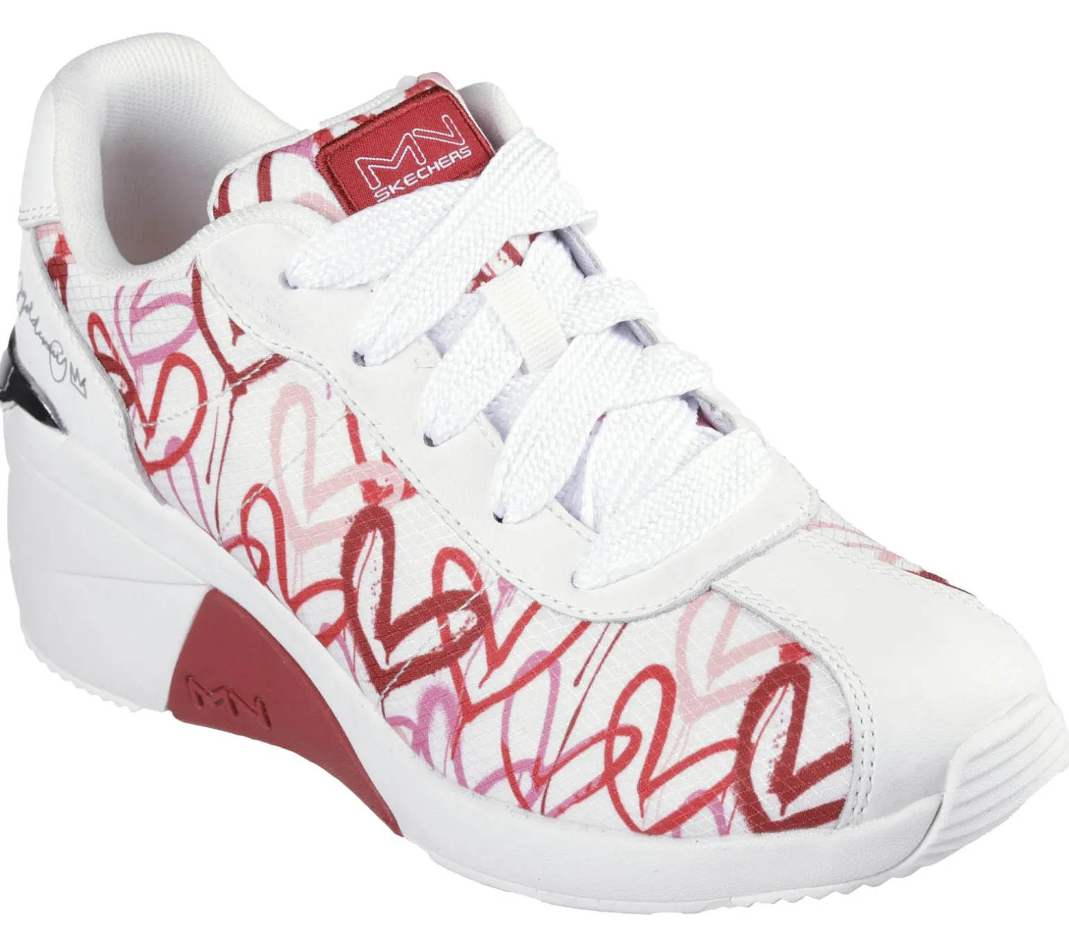 Internationally renowned muralist James Goldcrown brings his iconic #Lovewall heart designs to Mark Nason® Skechers in this inspiring collaboration. Let love lift you up wearing JGoldcrown x Mark Nason® Skechers: A Wedge. This lace-up high-wedge fashion sneaker features the artist’s signature heart design in an allover print with leather overlays, a high-gloss heel clip, Memory Foam Lux insole cushioning, and a color-blocked midsole.