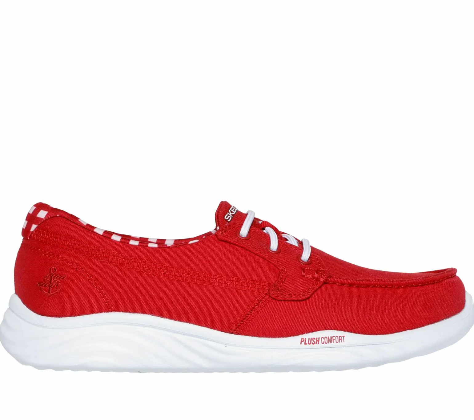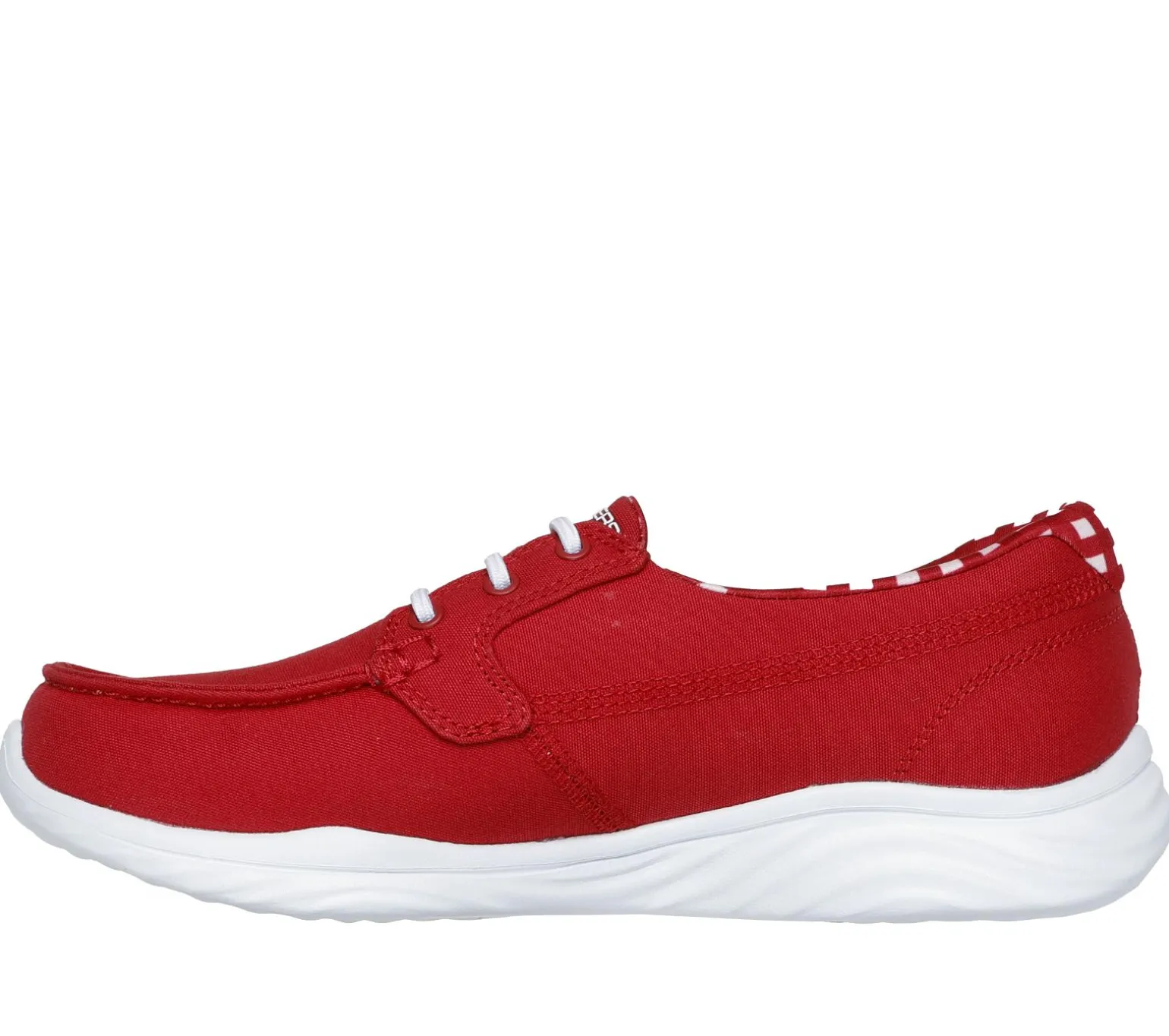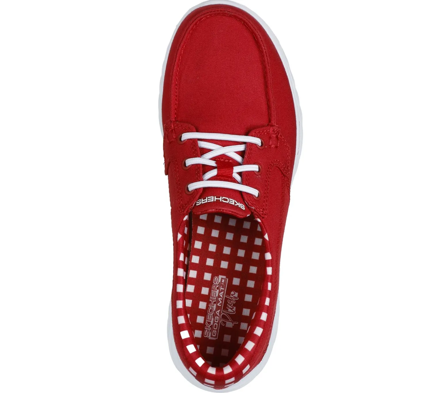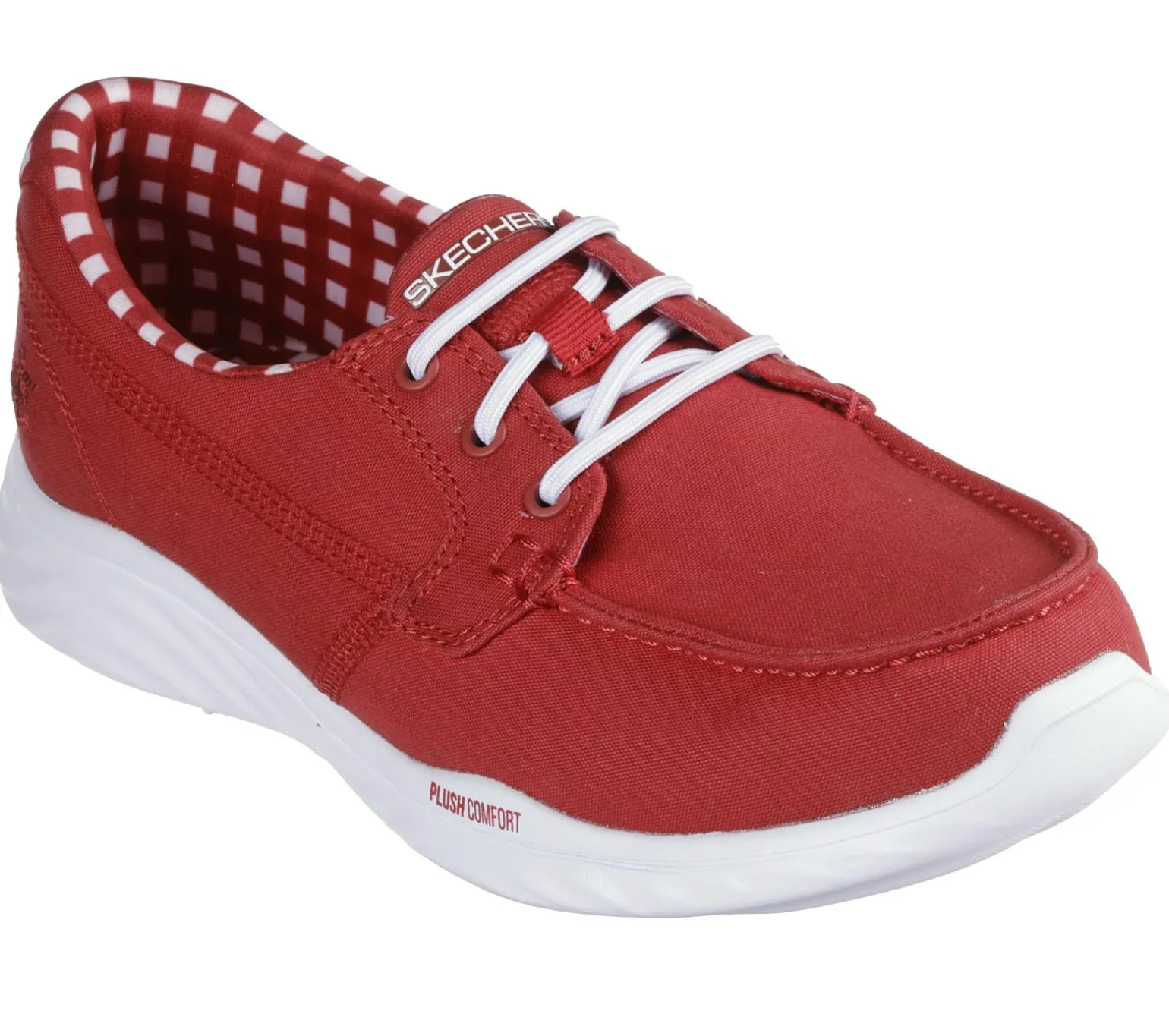 Classic nautical style and comfort combine in Skechers On-the-GO® Ideal – Picnic Perfect. This boat style design features a canvas upper with stretch lace detail, gingham trim, Goga Mat® Plush insole and lightweight ULTRA GO® cushioning.