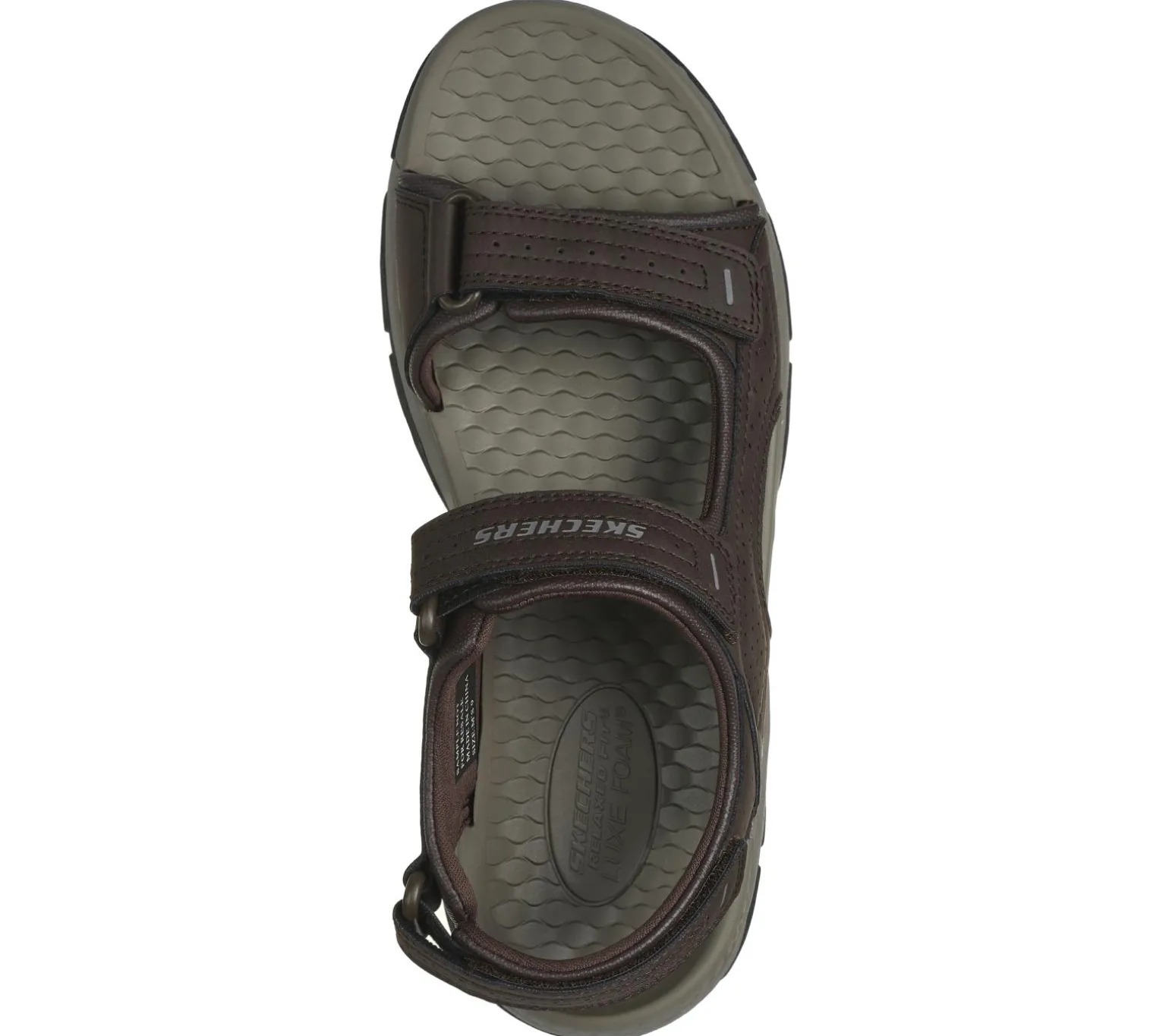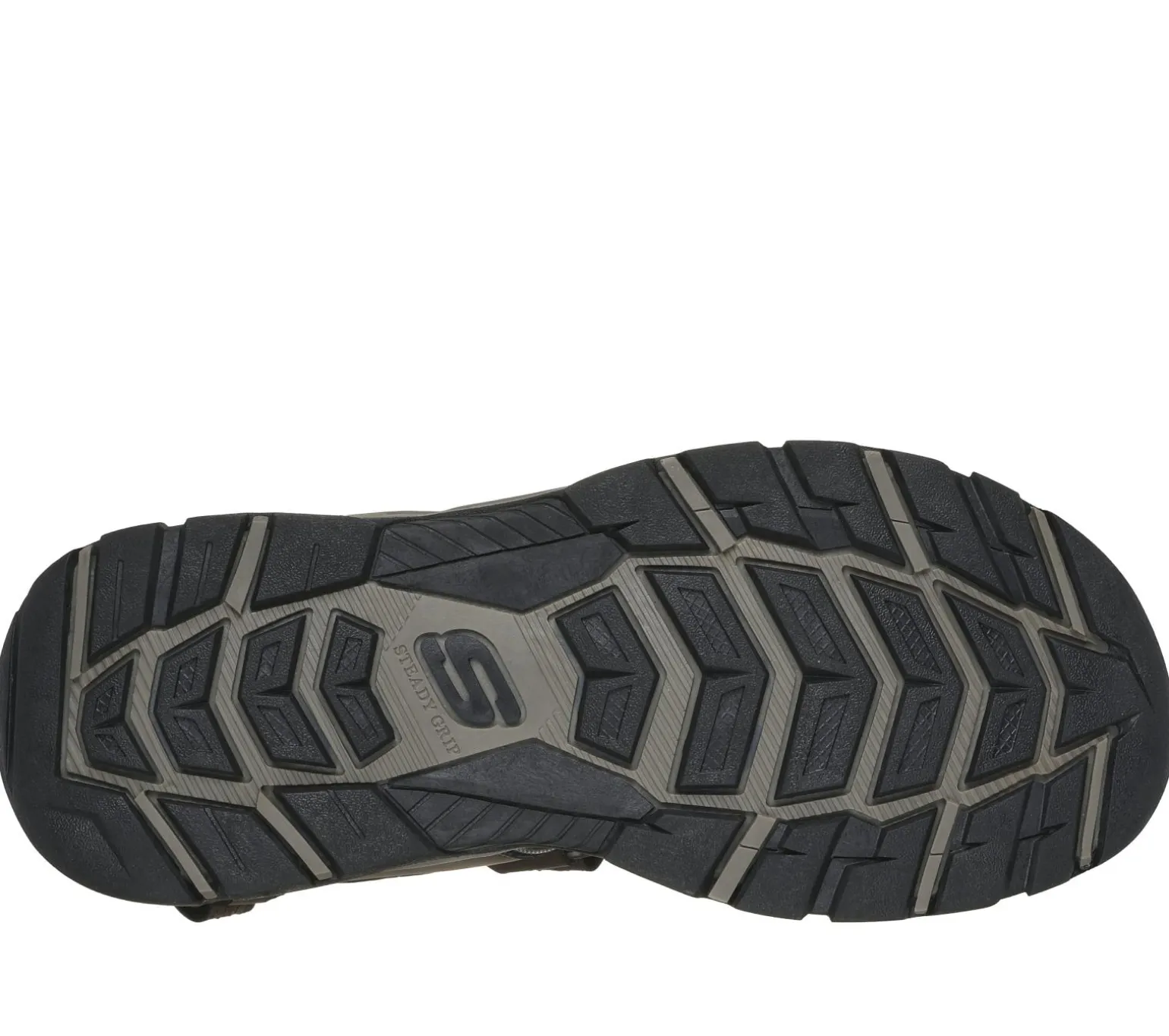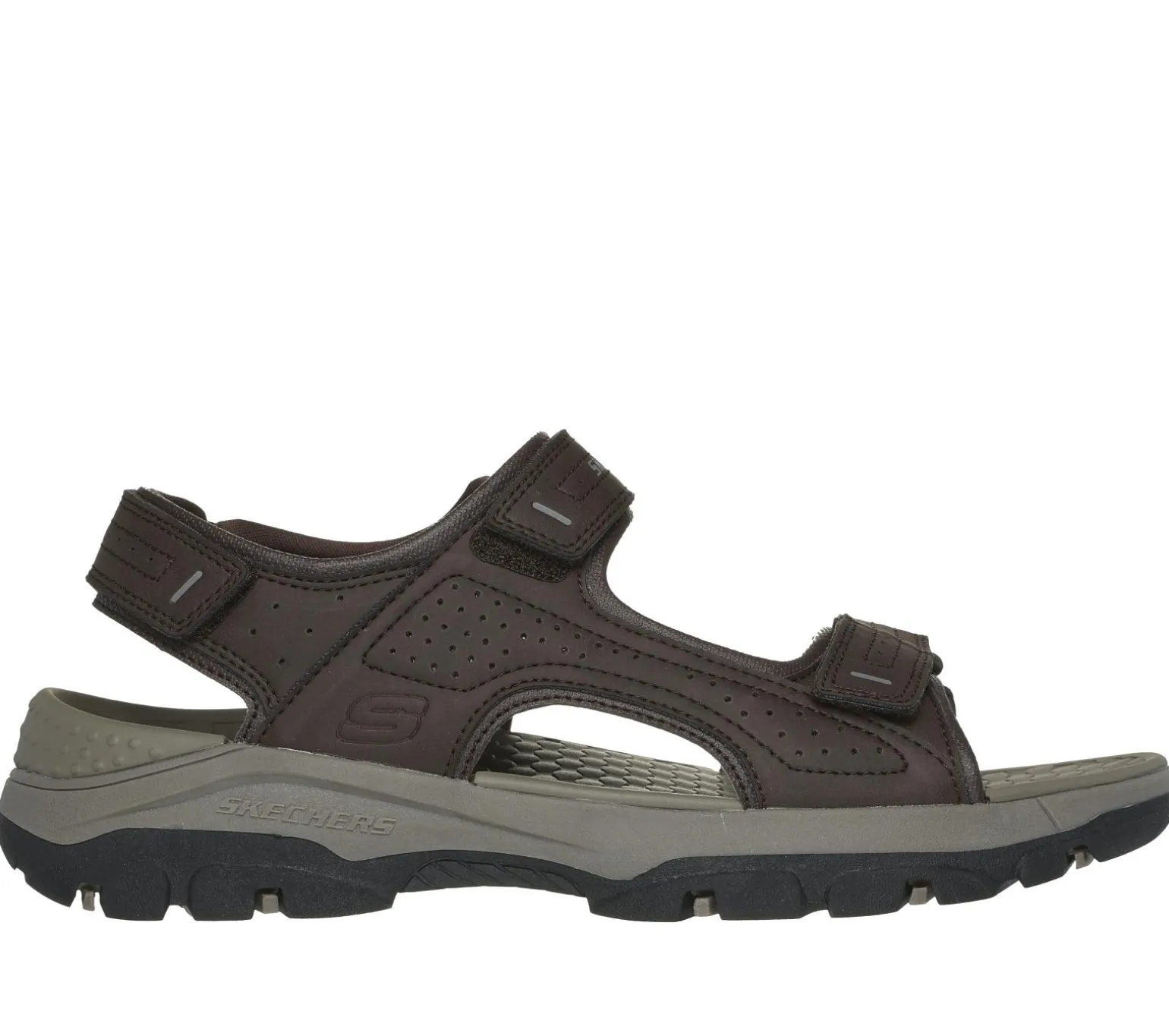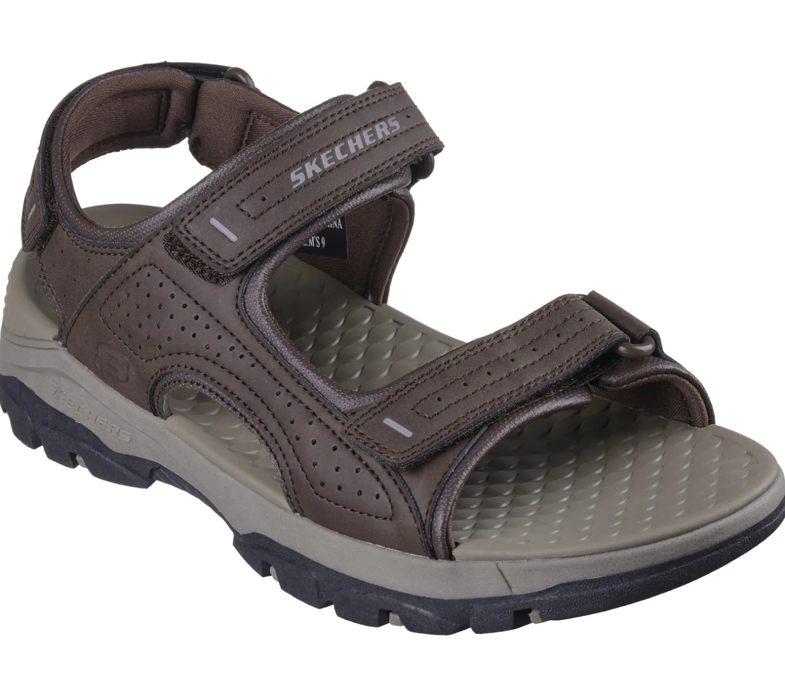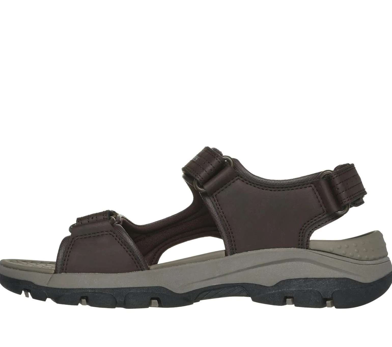 Travel all day in long-lasting comfort with the Skechers Tresmen – Garo sandal. This Relaxed Fit open-toe sandal features a durable synthetic upper with a cushioned Luxe Foam footbed, and a hook and loop ankle-strap closure.