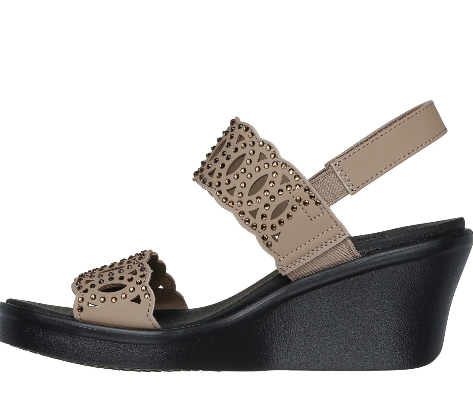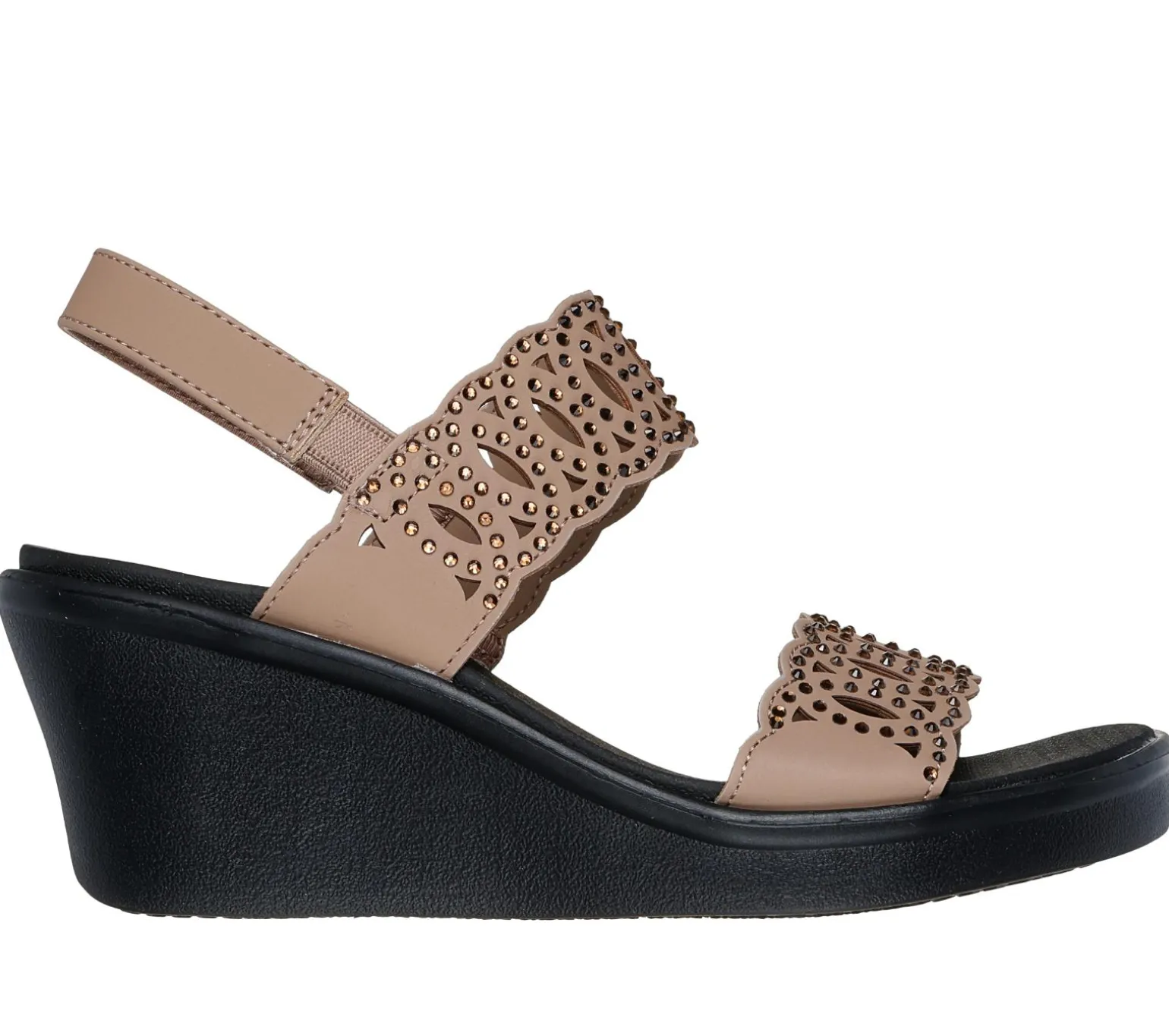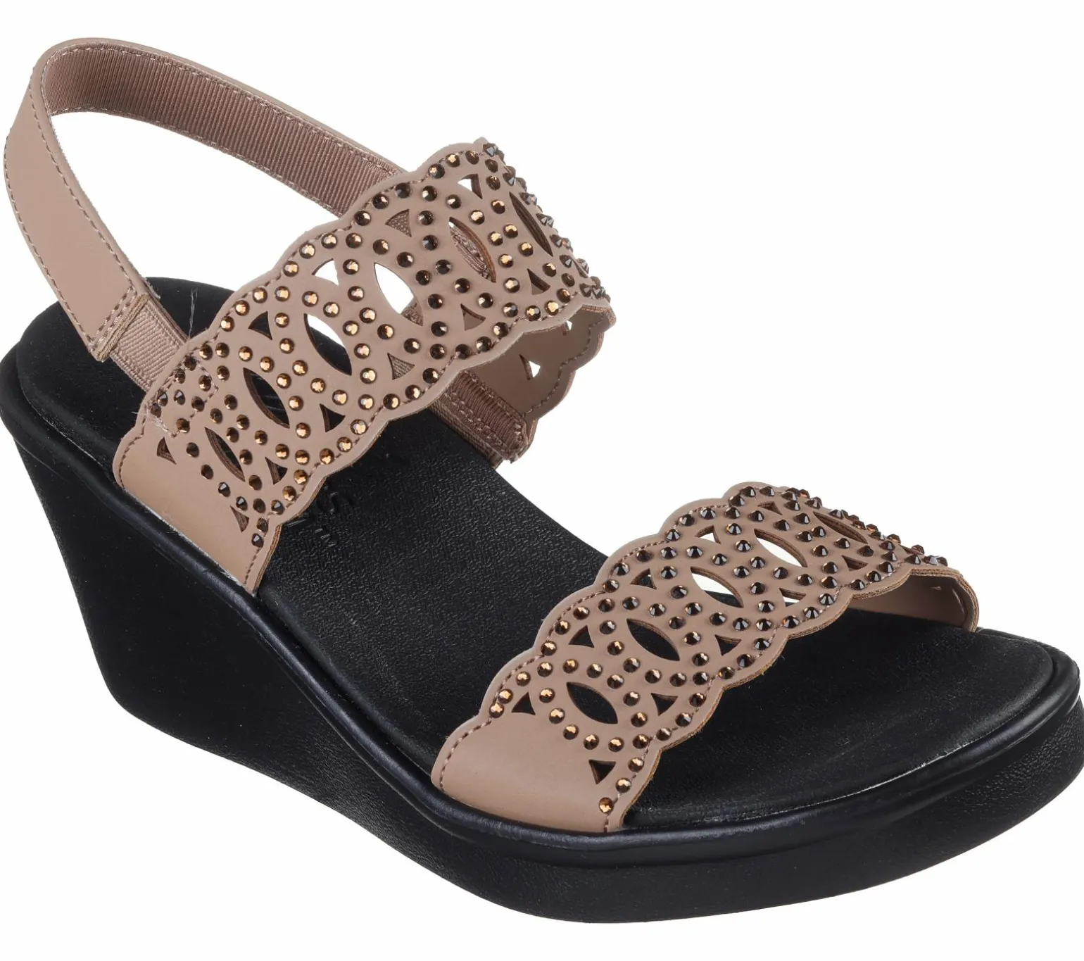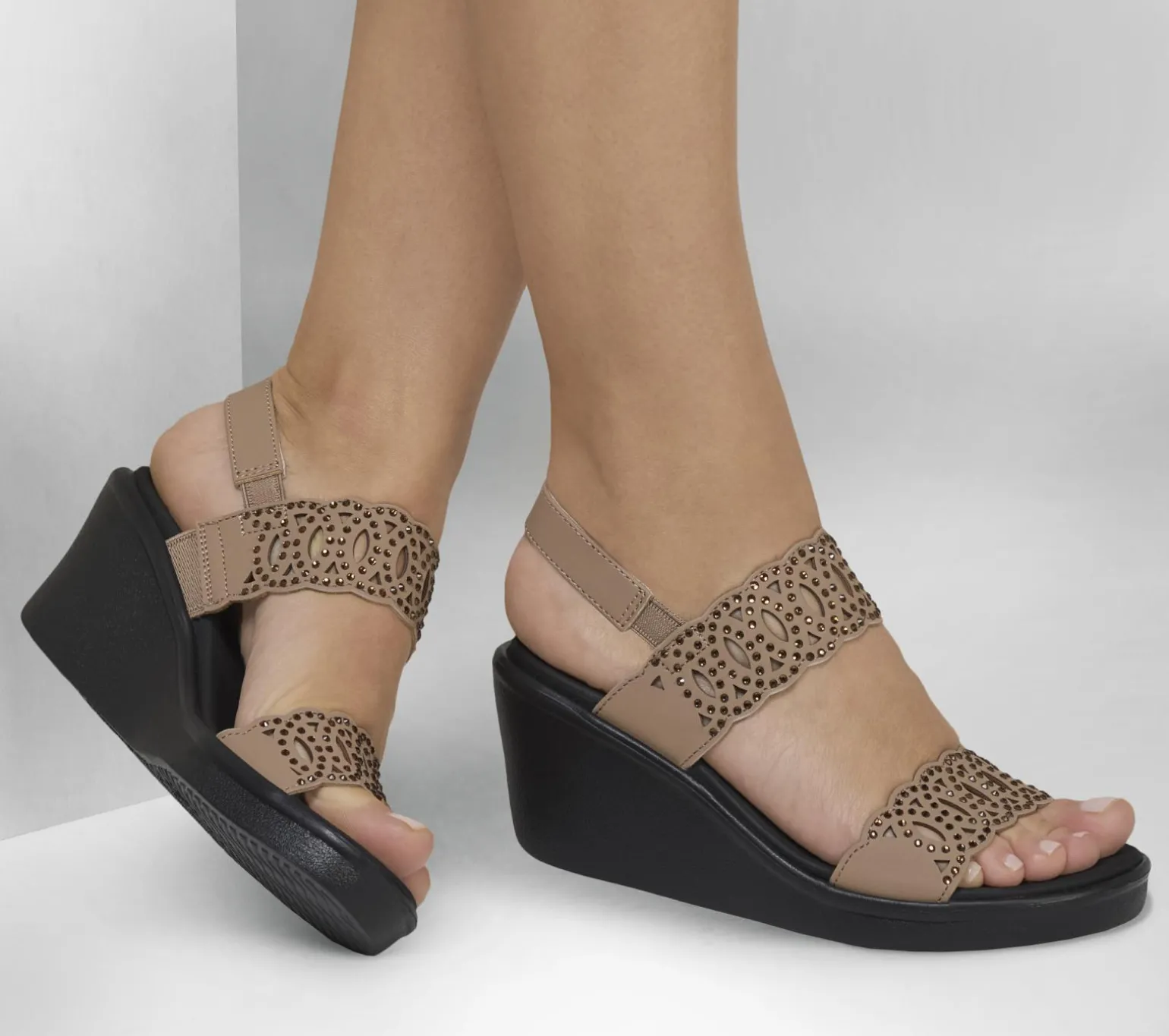 Diamond style comfort and looks combine in Skechers Cali® Rumble On – Just Dance. This vegan wedge sandal features a rhinestone embellished laser cut faux suede upper with a slingback strap and a cushioned Luxe Foam® footbed.