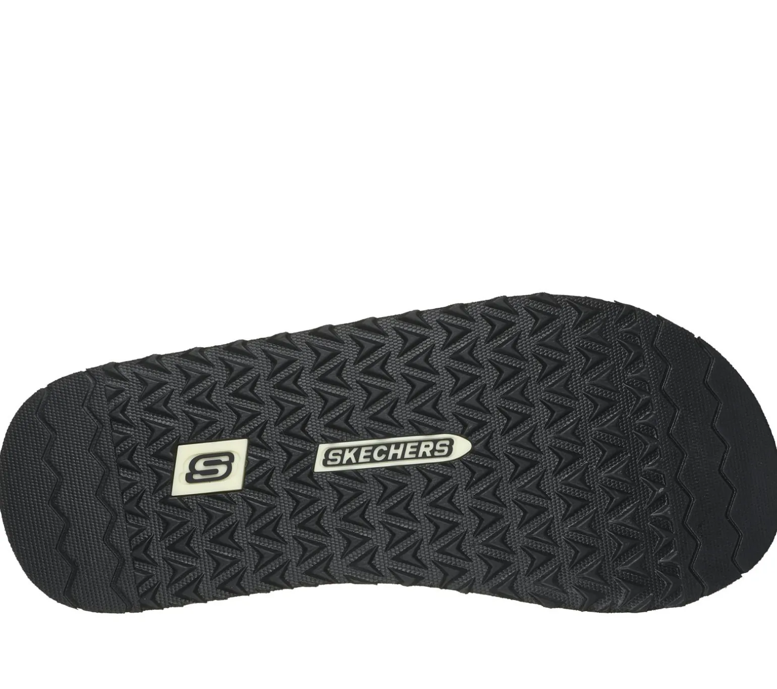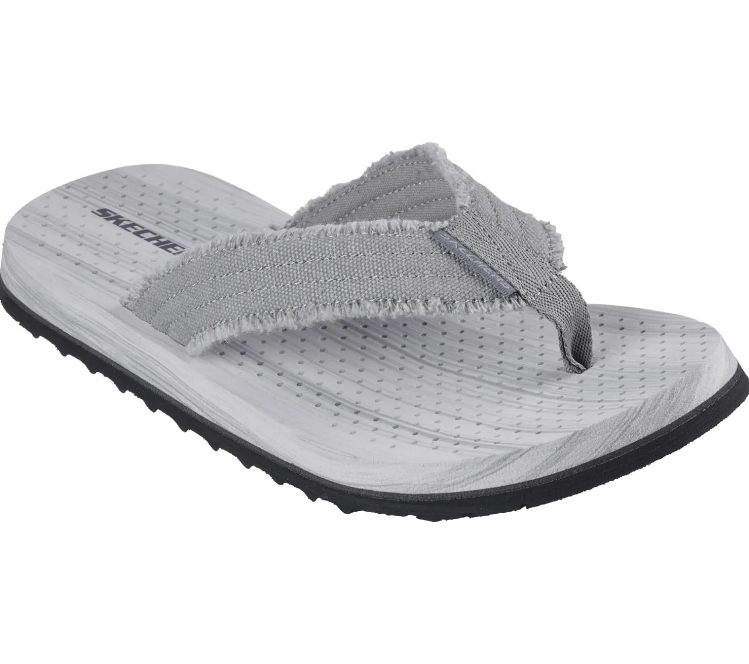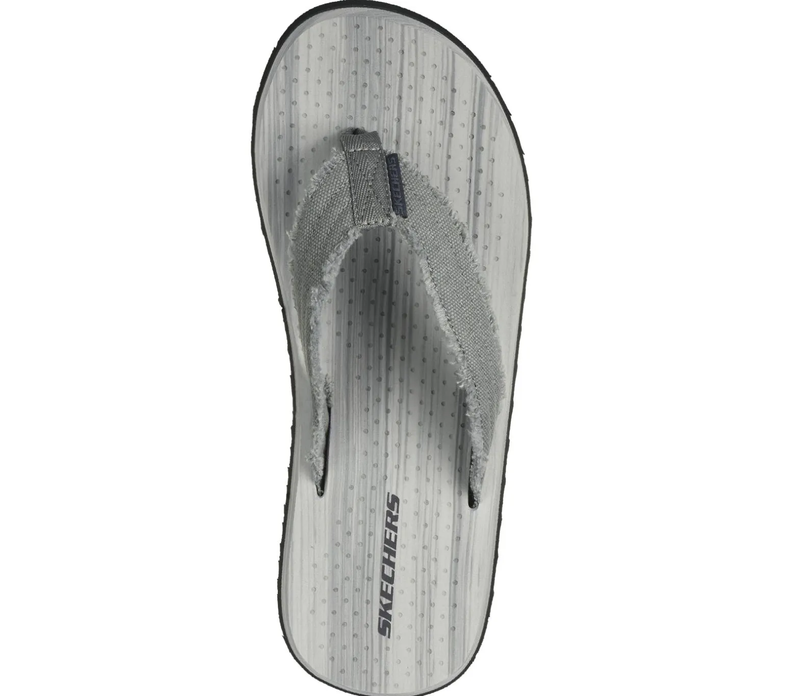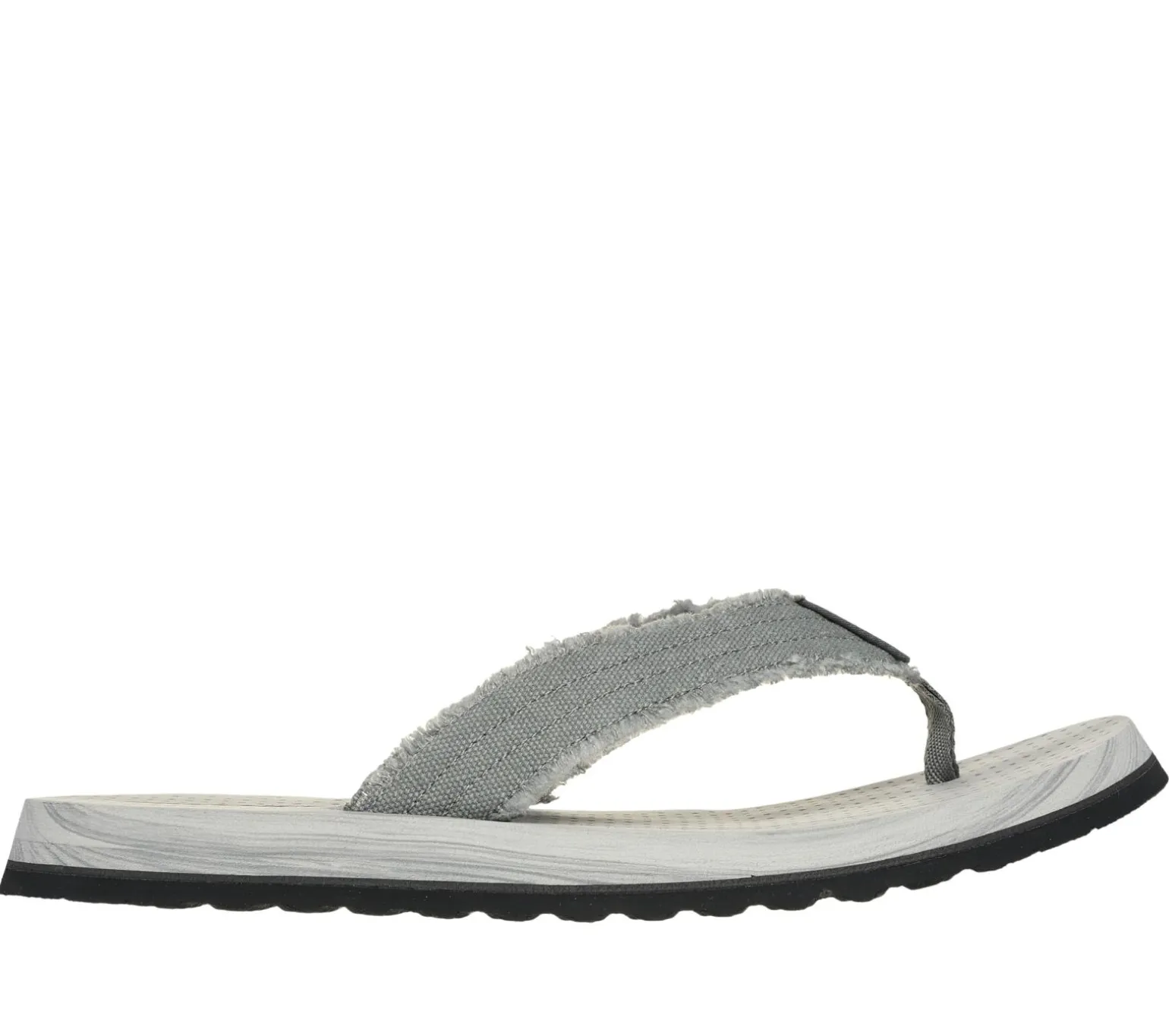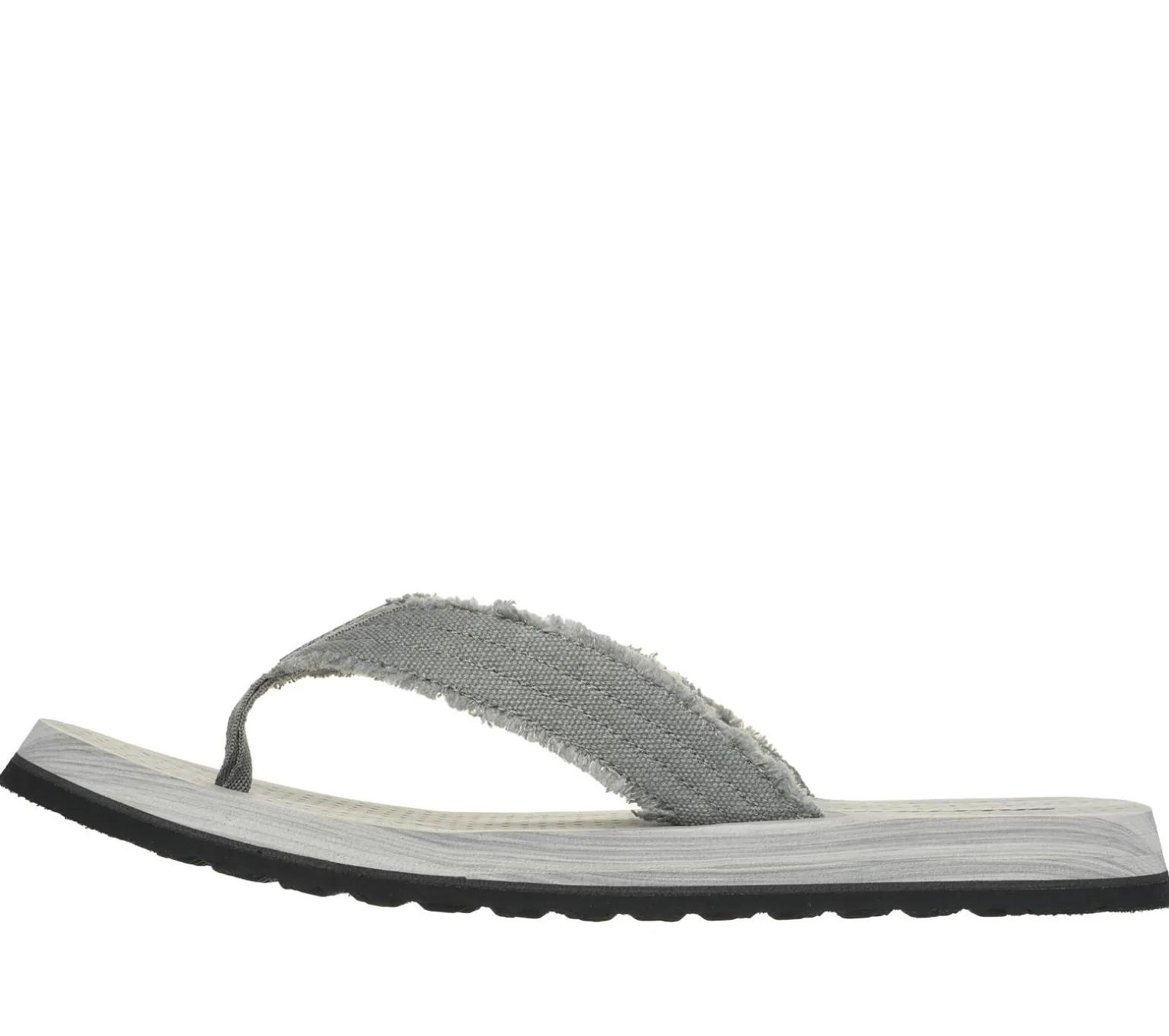 Bring on the sand, surf, and sun in Skechers Tantric – Fritz. This casual 3-point thong sandal features a frayed canvas upper with a faux woodgrain and sports stripe detailed midsole.