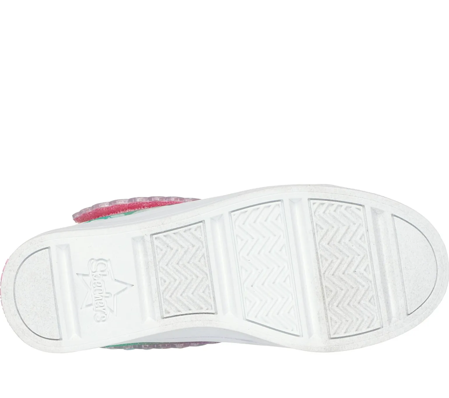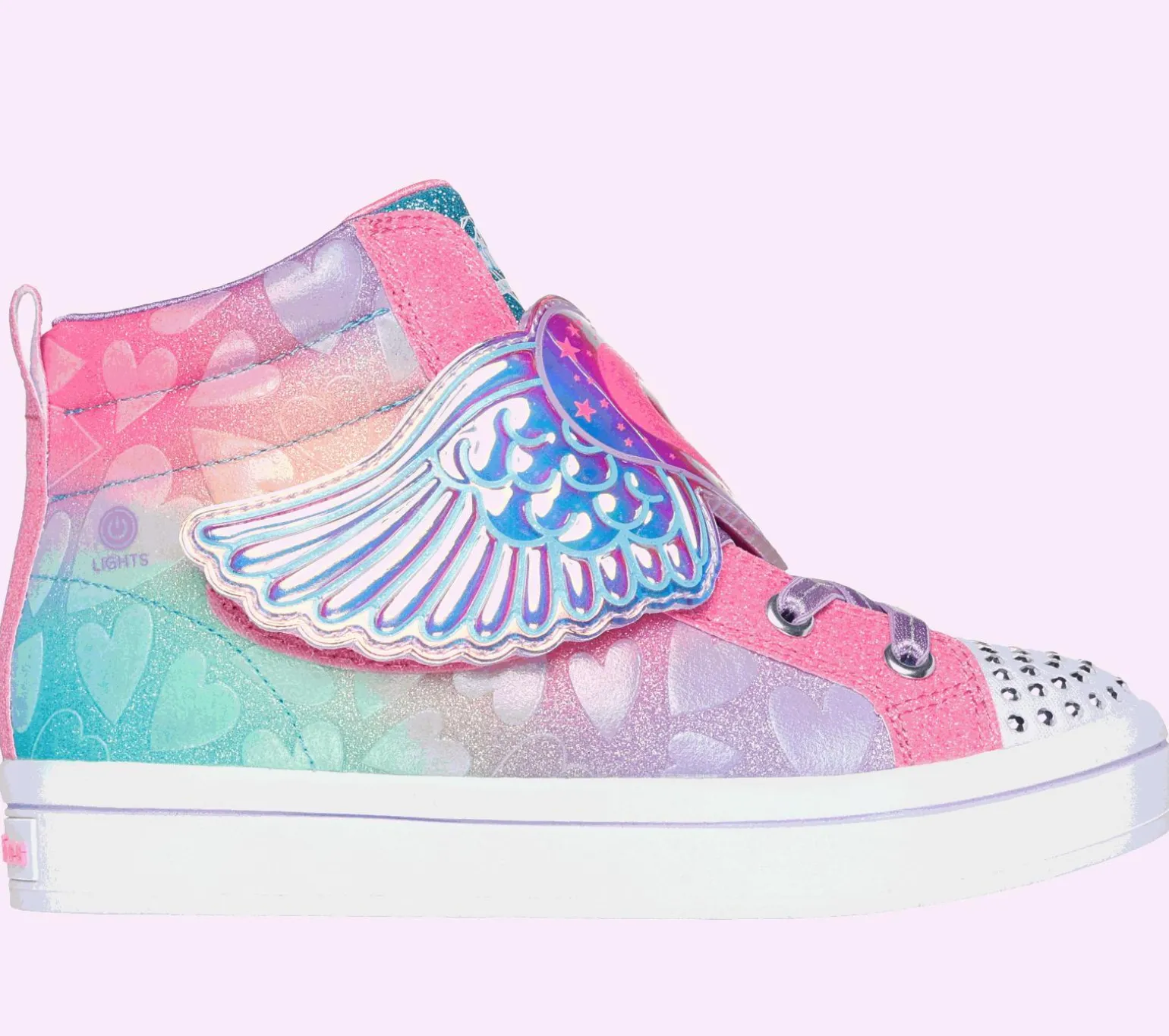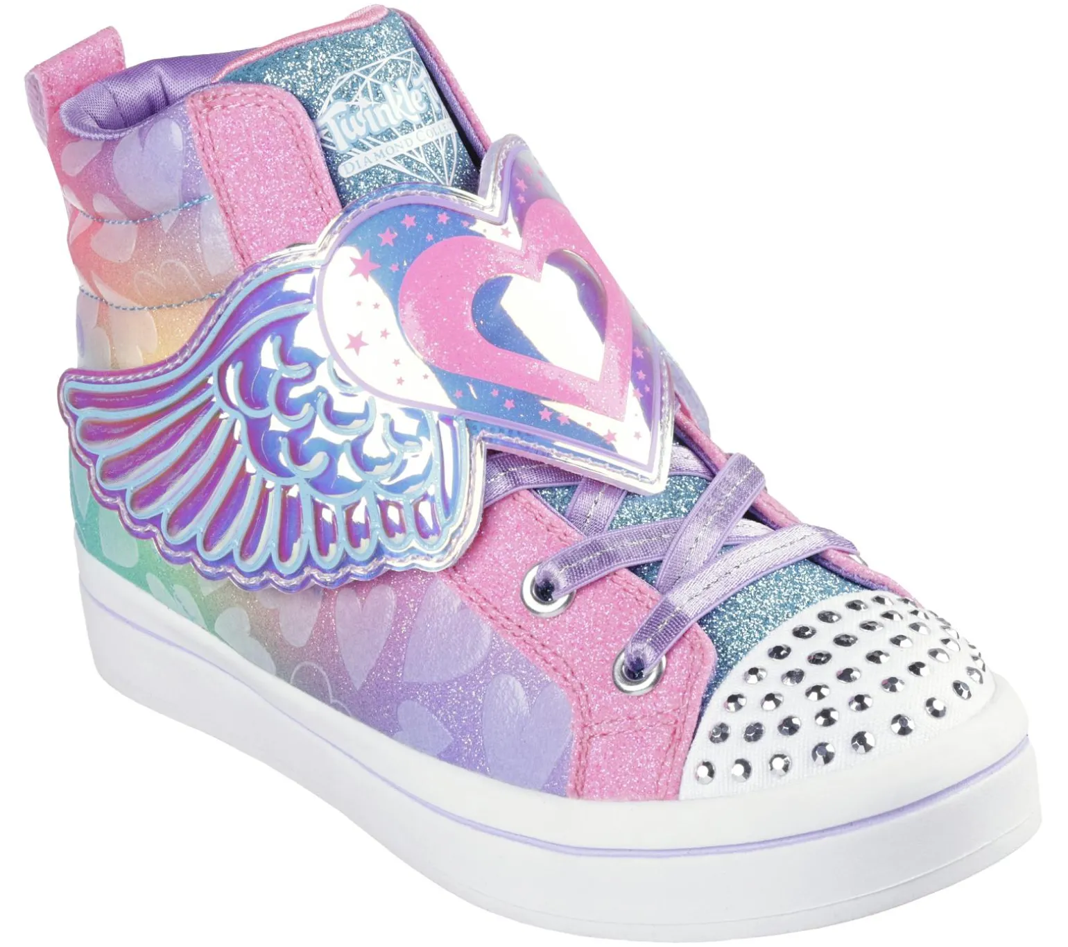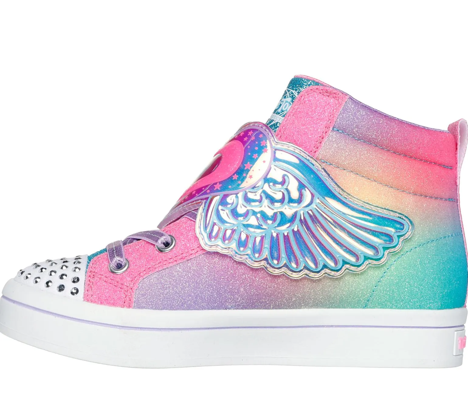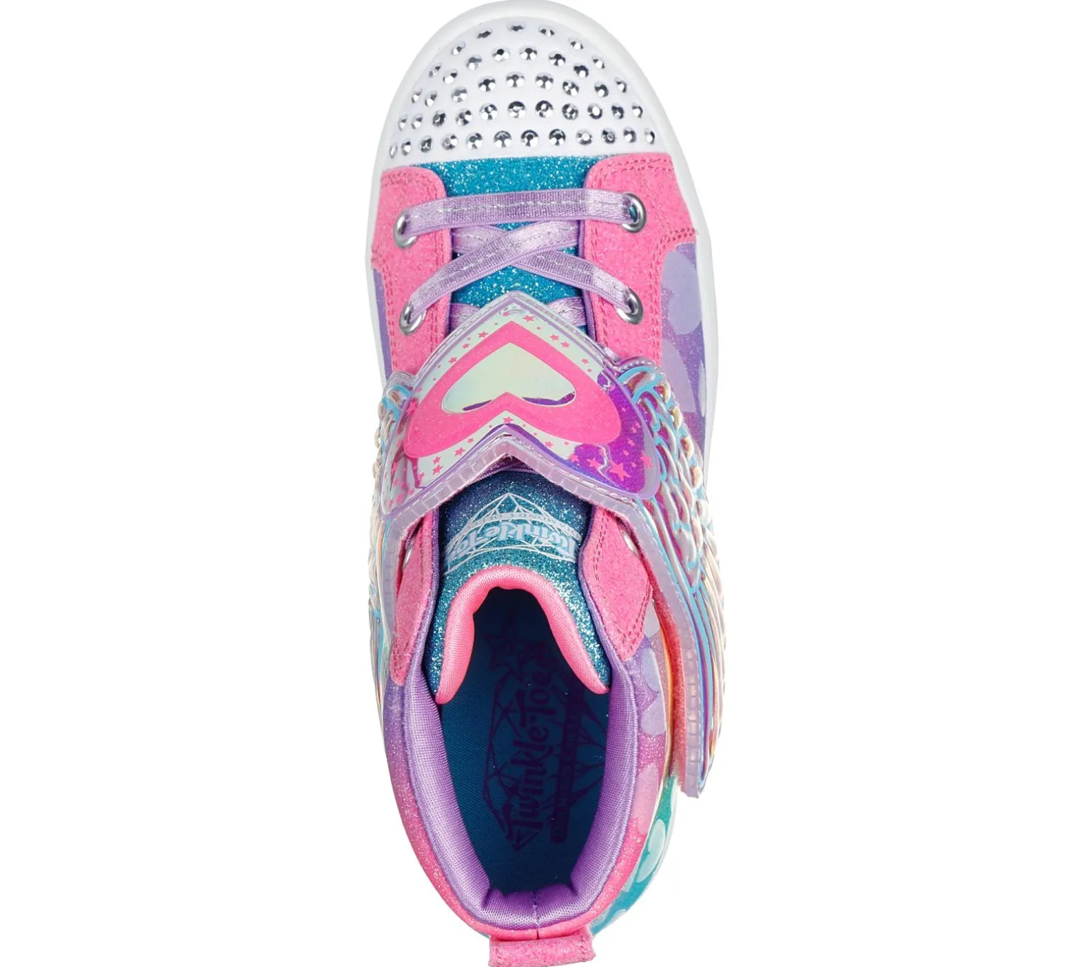 Sparkle and shine in style wearing Skechers Twinkle Toes®: Twi-Lites 2.0 – Flying Love. This high-top lighted design features a synthetic glitter finish upper with stretch laces, Skechers Adaptive Closure wing strap, rhinestud embellished toe, and a cushioned comfort footbed.