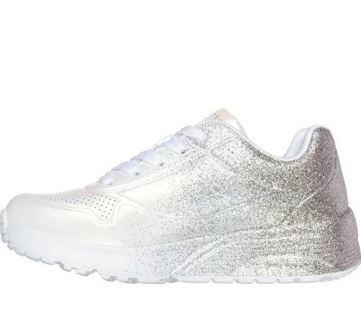 Glam up your outfit with cushioned comfort wearing Skechers Street Uno Lite – Metallic Shimmers. This lace-up fashion style features a synthetic metallic and glitter ombre upper, a Skechers Air-Cooled Memory Foam® insole, plus a platform wedge cushioned midsole.