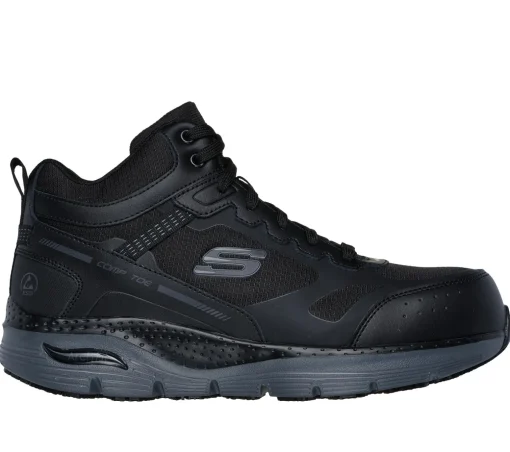 Move throughout your day in safety and supportive comfort wearing Skechers Work: Arch Fit® Slip-Resistant – Pyreford. This lace-up high-top has been granted the APMA Seal of Acceptance and features a leather, textile, and mesh upper with a composite nonmetallic safety toe, removable Skechers Arch Fit® insole, plus a Slip-resistant outsole.